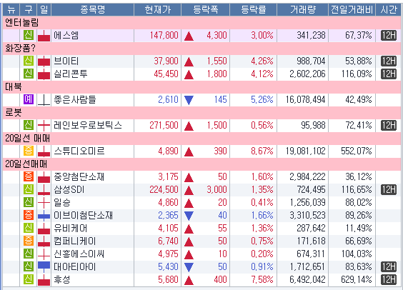 이 친구는 이번에 새롭게 편입했는데 다른 종목들처럼 꽤나 높은 거래량을 갖고 이전 박스권 상단까지 오는 모습을 보여주었다. 아직 사기는 너무 이르고 눌림에 5일선 20일선 60일선 으로 나누어서 매수를 하면 다시 박스권 상단으로 올 확률이 높을 것으로 보인다. 관심을 갖고 지켜봐 보자.